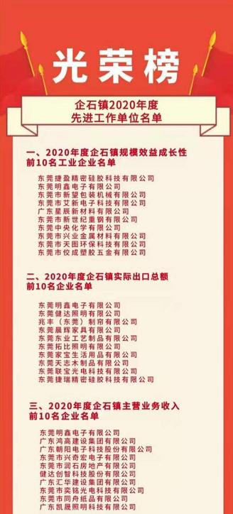3月3日上午,企石鎮(zhèn)召開2020年度工作總結(jié)大會,發(fā)布了《企石鎮(zhèn)2020年度先進(jìn)工作單位名單》,包括《2020 年度企石鎮(zhèn)規(guī)模效益成長性前10名工業(yè)企業(yè)名單》《2020 年度企石鎮(zhèn)實際出口總額前10名企業(yè)名單》《2020 年度企石鎮(zhèn)主營業(yè)務(wù)收入前10名企業(yè)名單》等10份名單。會議對2020年度企石鎮(zhèn)主營業(yè)務(wù)收入前10名企業(yè)進(jìn)行了現(xiàn)場表彰。新望公司有幸入列:企石鎮(zhèn)2020年度規(guī)模效益成長性10名。